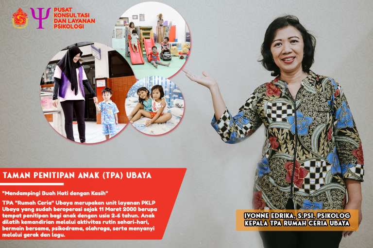 Taman Penitipan Anak Rumah Ceria UBAYA merupakan wadah pembelajaran pra sekolah untuk anak usia 2-5 tahun, yang ditujukan untuk melatih kecakapan & ketrampilan hidup dasar (basic life skills & competence) secara utuh dan seimbang melalui pendekatan pendidikan yang disesuaikan dengan tahap perkembangan anak. TPA Rumah Ceria UBAYA mulai beroperasi pada tgl 11 Maret 2000.